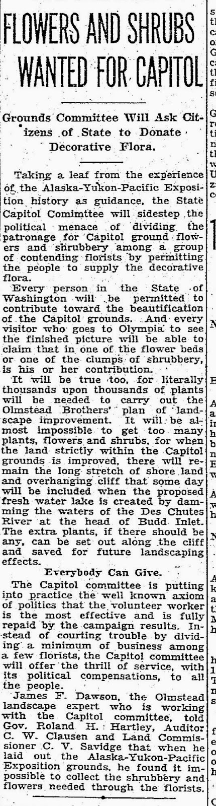 From April, 1929 in the Seattle Times about the need for plants for capitol landscaping: