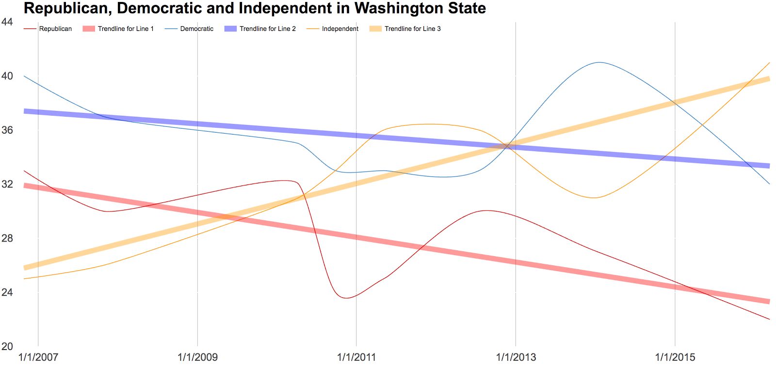 Basically, following the trendlines, both the Republican and Democratic parties have lost marketshare and three times since 2006 there have been more identified independents than anything else. Also, in the most recent survey from last fall, the independent identification has a big lead.