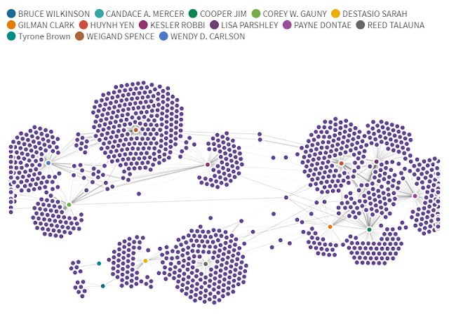 Turns out the contributors thought the same thing. Contributions for all the right-hand side candidates (Mercer, Gauny, Kesler, Weigand and Carlson), mainline (Cooper, Gilman, Huynh, Parshley and Payne ) and left-hand (Wilkinson, Destasio, Reed and Brown) are generally distinct from each other. When there are connections, they are connected through the mainline group. There were a lot of contributors that gave to multiple candidates, but mainly to either the left or right and the mainline. Out of more than 1,200 individual contributors, there was only one that gave to both left and right.