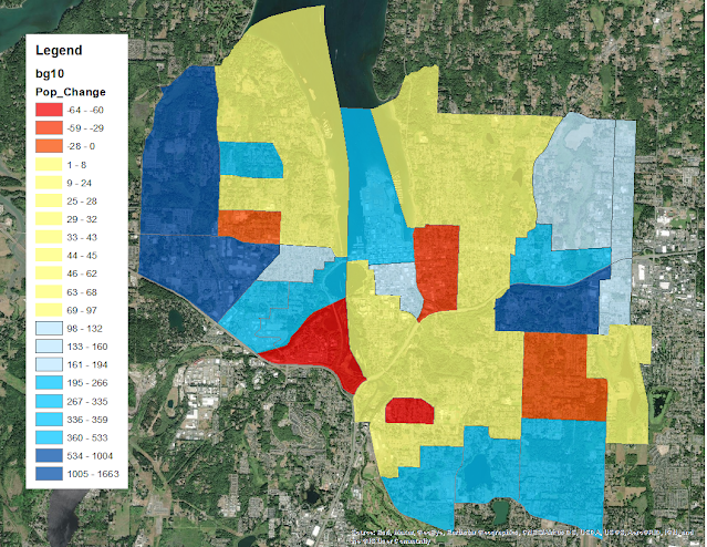 - Block groups are just about the narrowest geography you can assess changes in population change across Olympia. I had to cross-walk a few block groups that had broken in smaller pieces. I posted my notes on that in this spreadsheet.