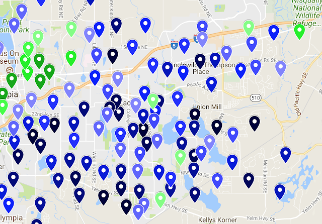 The most Denton precincts in this map seem to be a straight line from the outside of the Olympia westside into Tumwater, which gives some credibility to her being a moderate candidate or at least a moderate candidate from the voters’ point of view. But, she also won College, which is the most liberal precinct in the county. So, who knows?